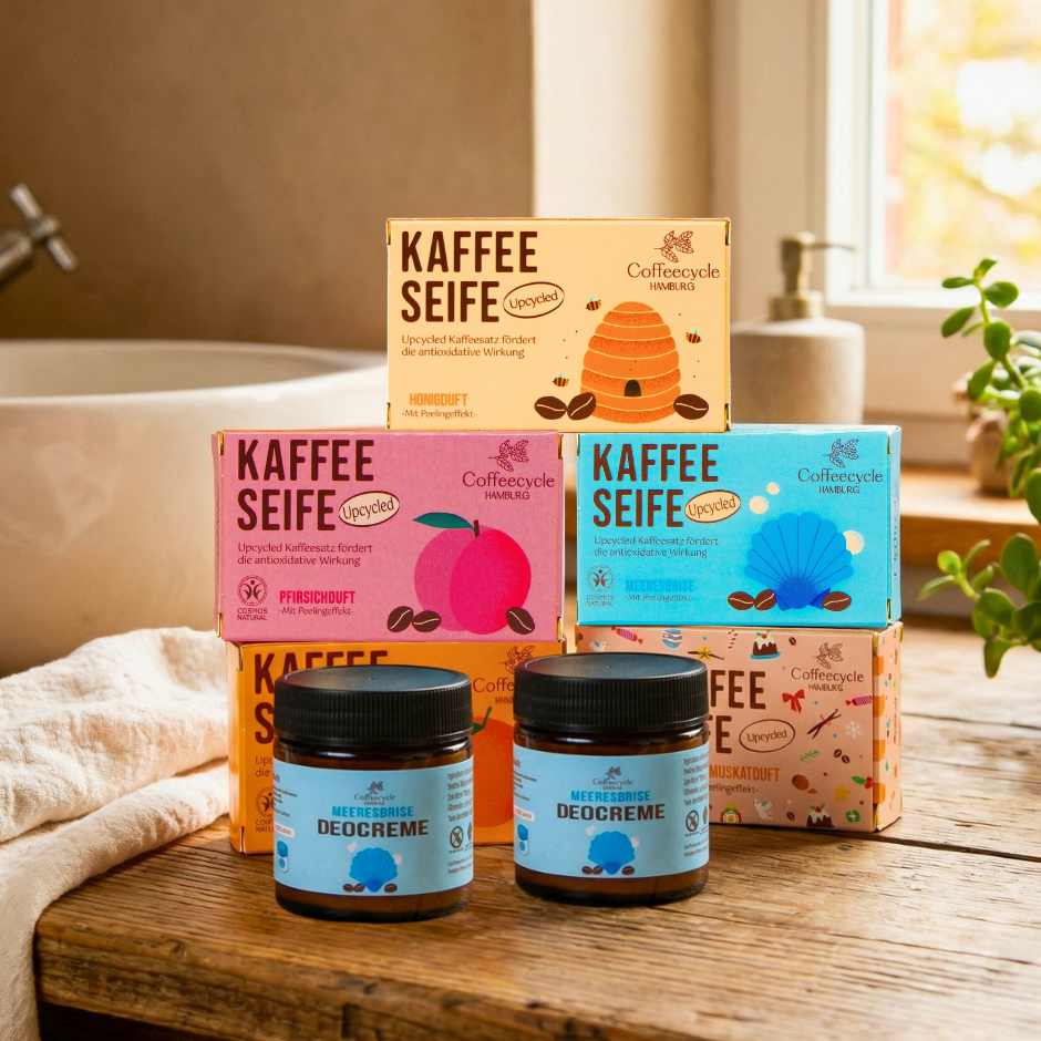 Die Kaffeeseife enthält feine Kaffeepartikel aus upcycled Kaffeesatz. Diese reinigen sanft, glätten die Haut und lassen sie sichtbar frischer wirken. Die im Kaffeesatz enthalten Antioxidantien unterstützen die natürliche Regeneration, während reichhaltige Pflanzenöle die Haut geschmeidig pflegen und vor dem Austrocknen bewahren.
