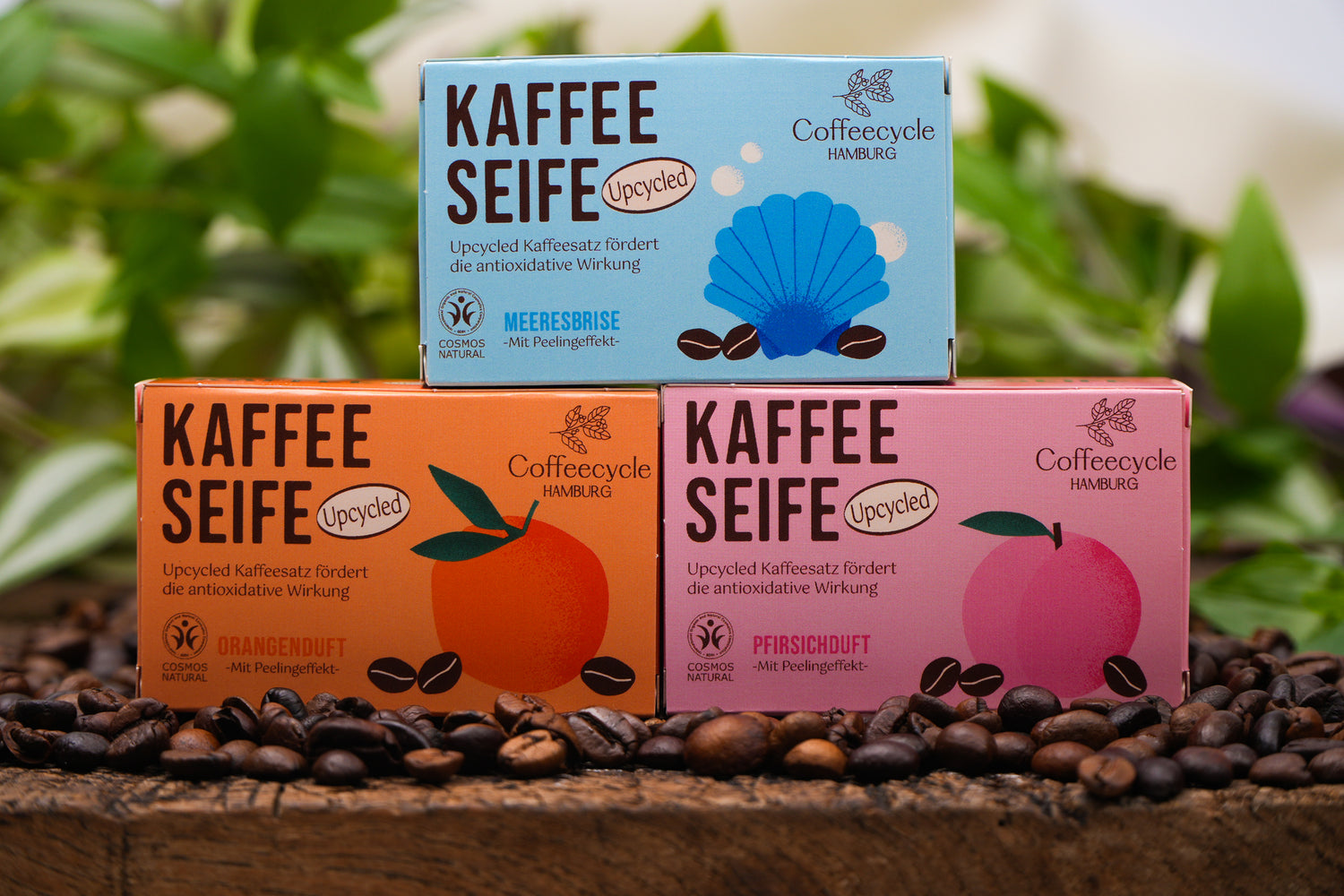 Alle Hand-und Körperseife mit sanftem Peeling aus recyceltem Kaffeesatz in einem Set. Zusätzlich die Deocreme mit Kaffeeöl und eine 150g-Seife im Wert von 15€ gratis dazu.