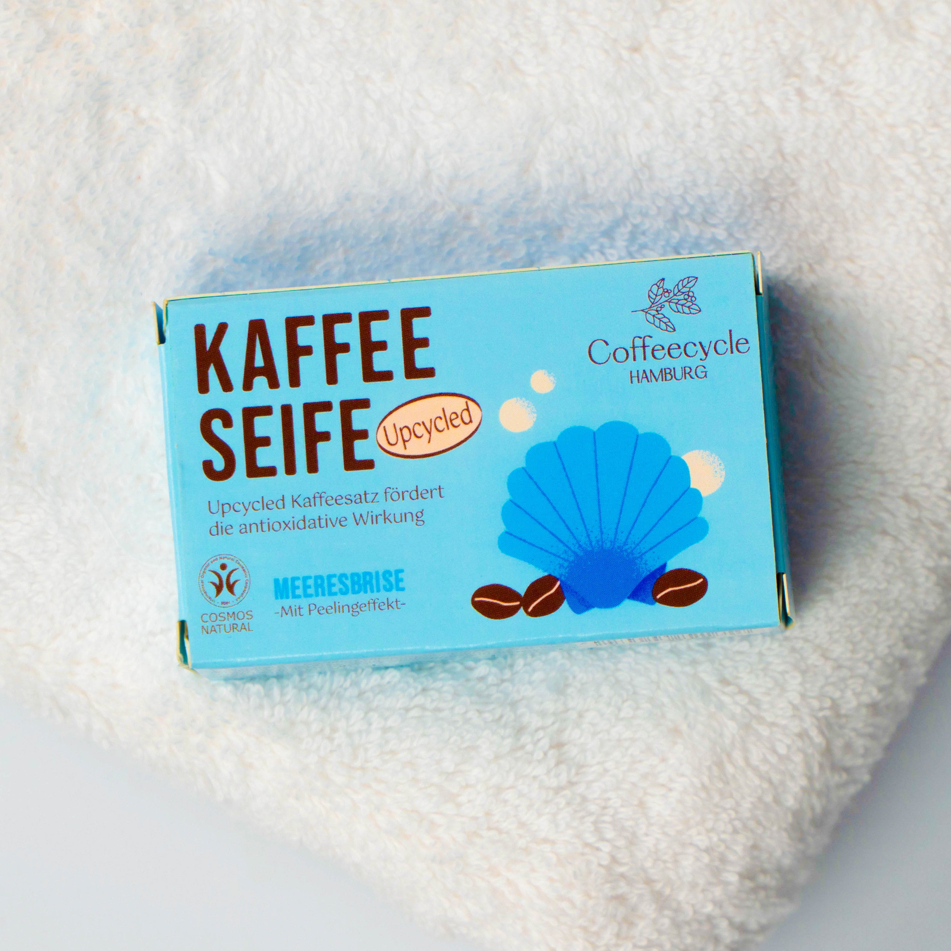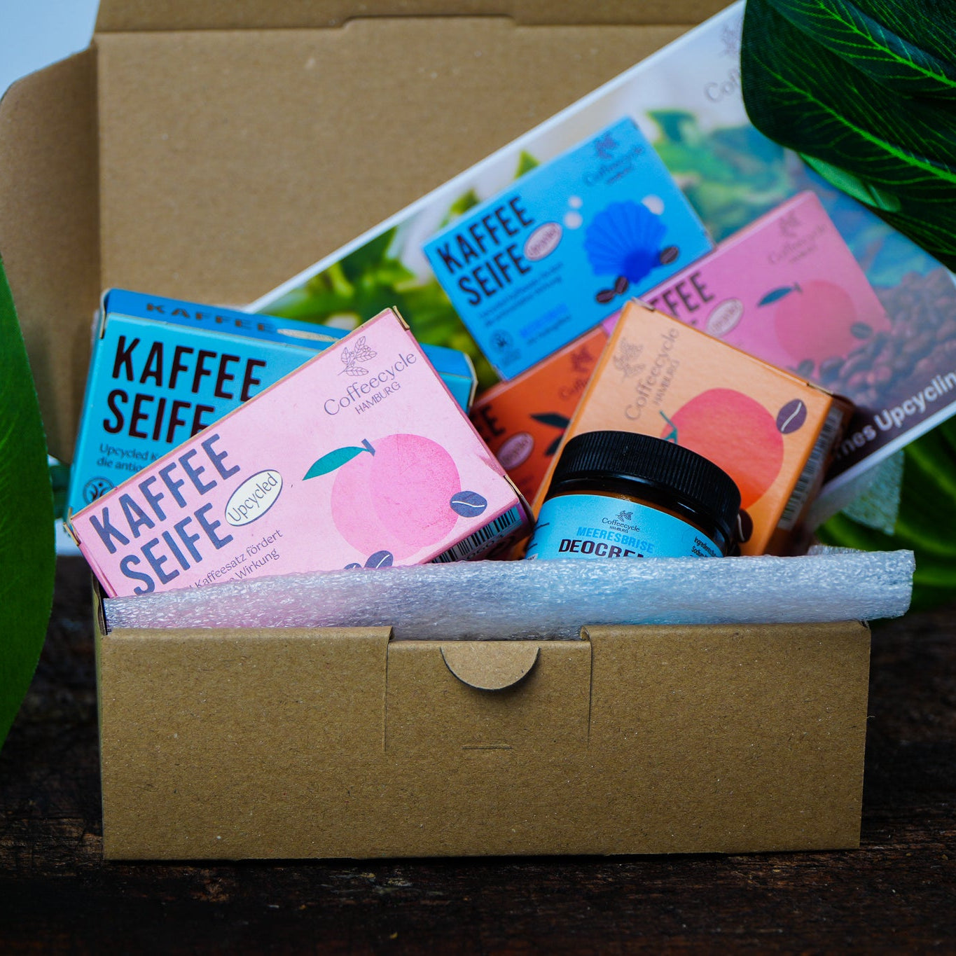 Das Starterset von Coffeecycle vereint nachhaltige Körperpflege mit frischem Duft. Enthalten sind die Deocreme Meeresbrise sowie drei handgemachte Kaffeeseifen in den Sorten Orange, Pfirsich und Meeresbrise; alle mit recyceltem Kaffeesatz und natürlichen Ölen. Die Deocreme pflegt sanft, wirkt zuverlässig gegen Gerüche und ist frei von Aluminium, Palmöl und Alkohol. Die Seifen reinigen schonend mit sanftem Peelingeffekt und pflegen mit Oliven- und Kokosöl.