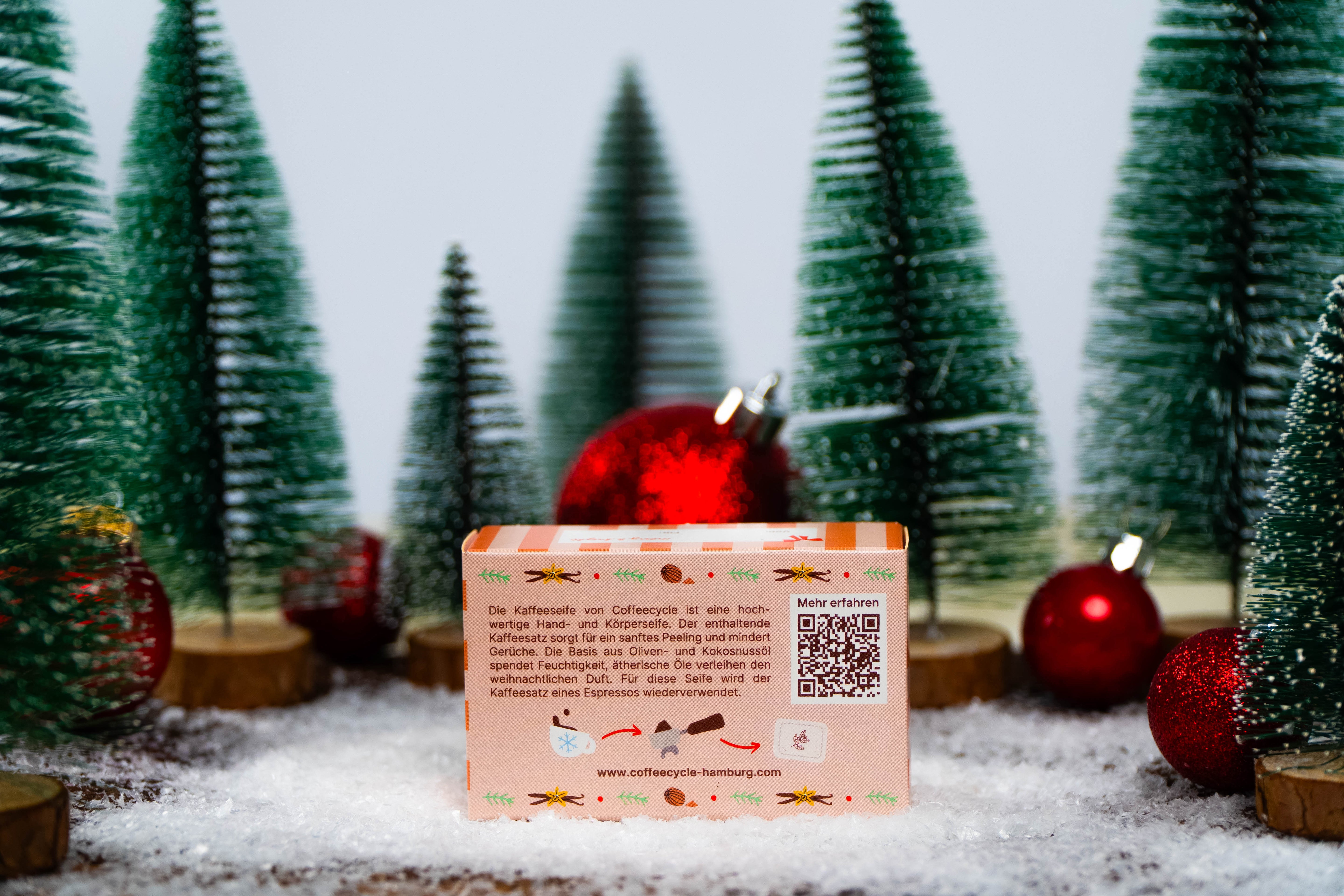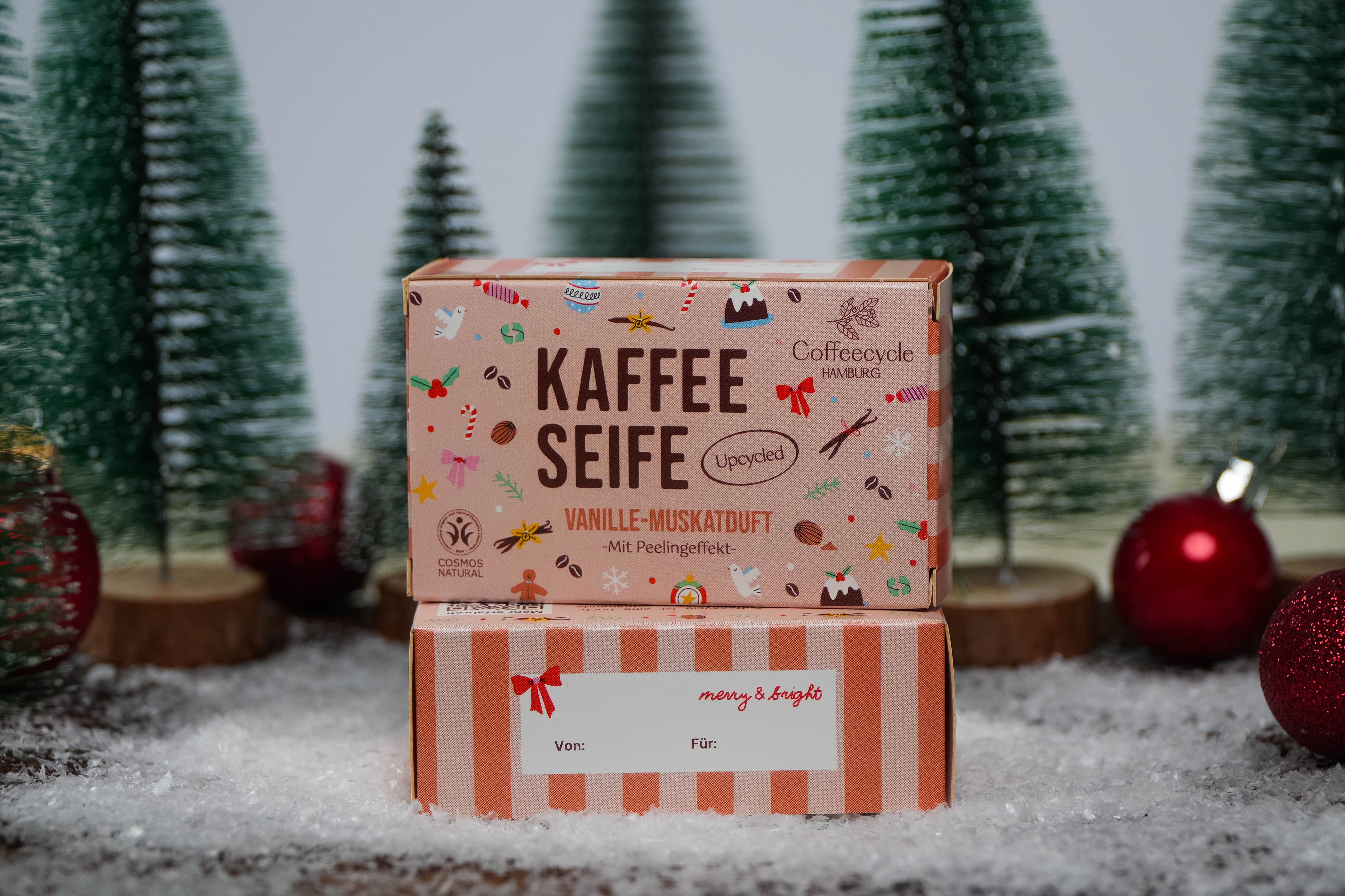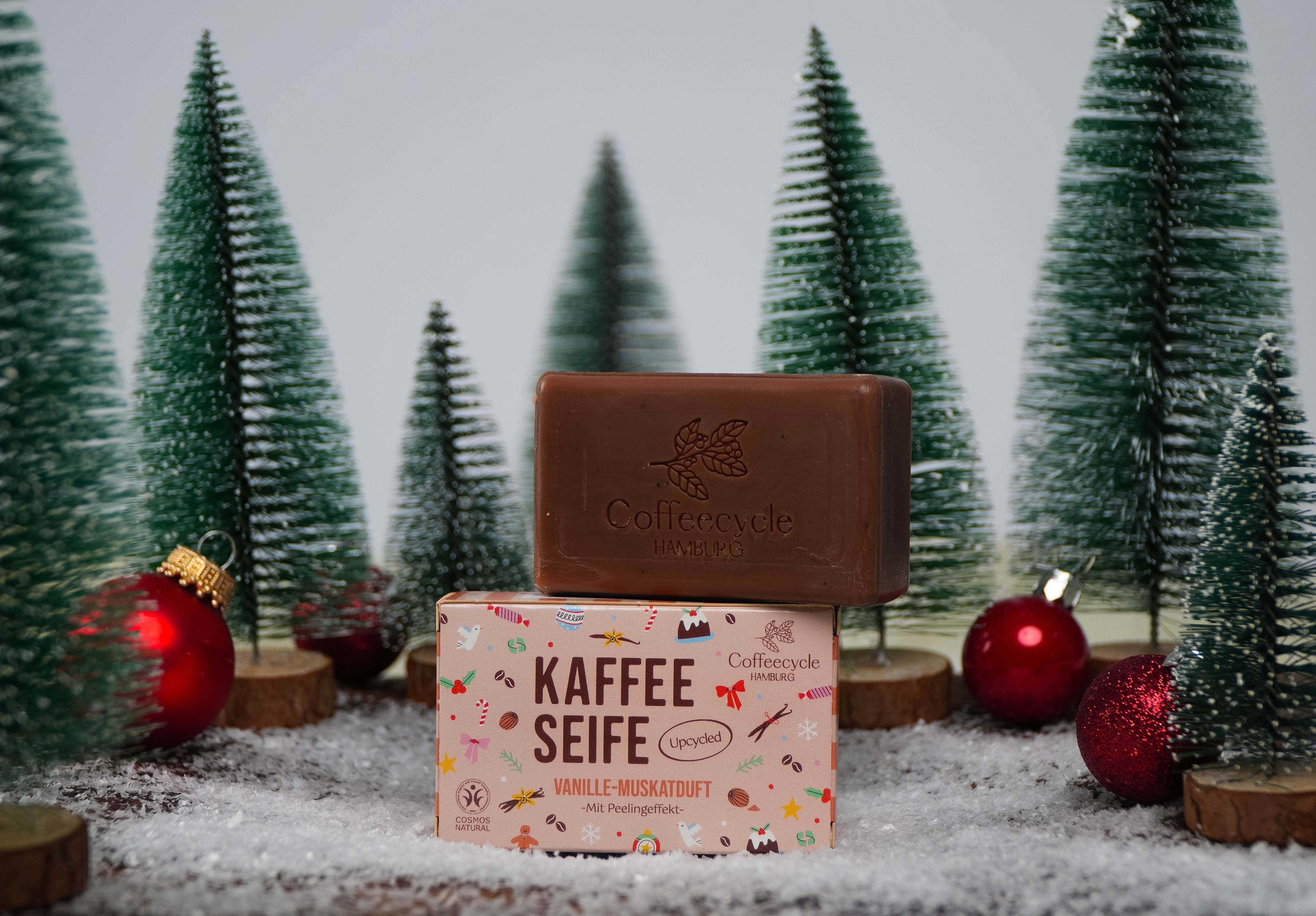 In der Weihnachtsseife Vanille-Muskat sorgt fein gemahlener Kaffeesatz für ein sanftes Peeling und natürliche Pflege. Die Basis aus Oliven- und Kokosnussöl spendet Feuchtigkeit und macht die Haut geschmeidig, während der warme Duft von Vanille und Muskat winterliche Geborgenheit verströmt. Die liebevolle Geschenkverpackung mit personalisierbarem Design macht sie zum perfekten Weihnachtsgeschenk.